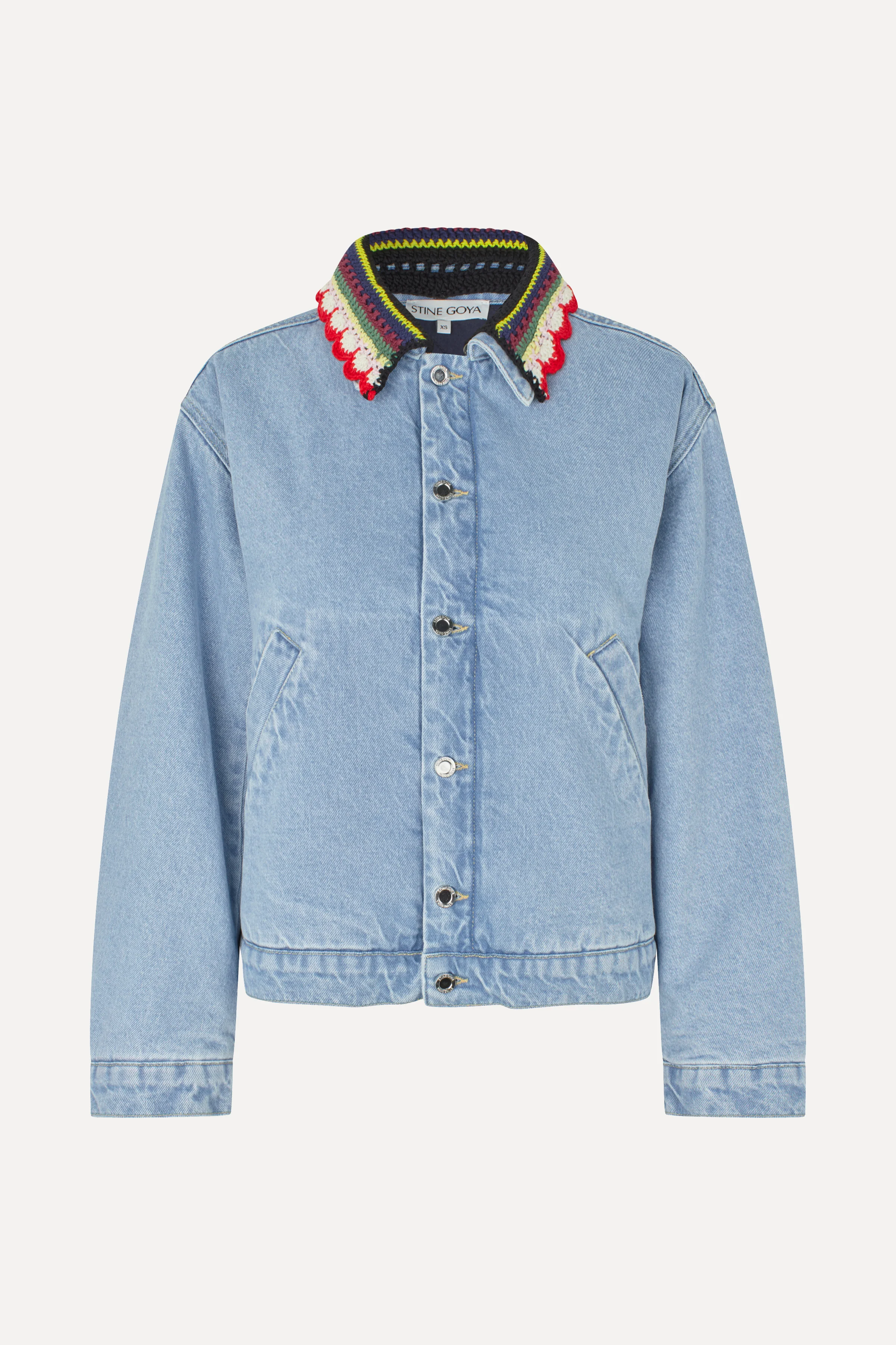 Light blue padded denim jacket with a relaxed, oversized fit. Features a removable crochet collar, button closure, and a small logo patch on the back.