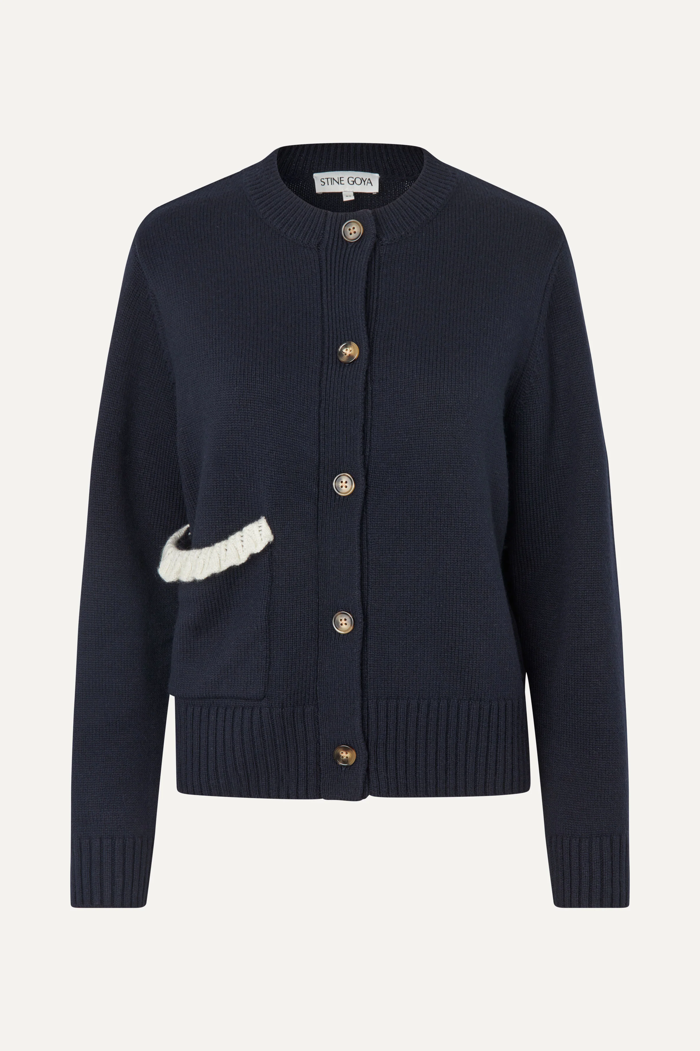 Navy knitted cardigan with crochet pocket detail and button closure. Features a crochet horseshoe and 'Good Luck' lettering on the back.