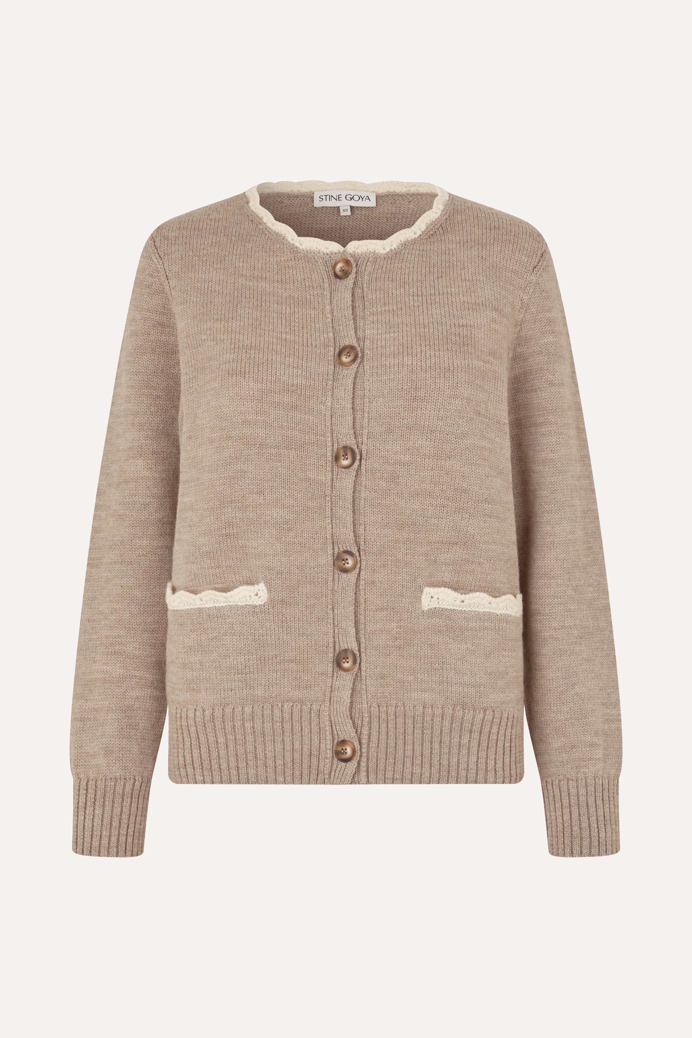 Beige wool blend cardigan with contrast crochet trim at neckline and pockets. Features a round neck, button-down front, and ribbed edges.