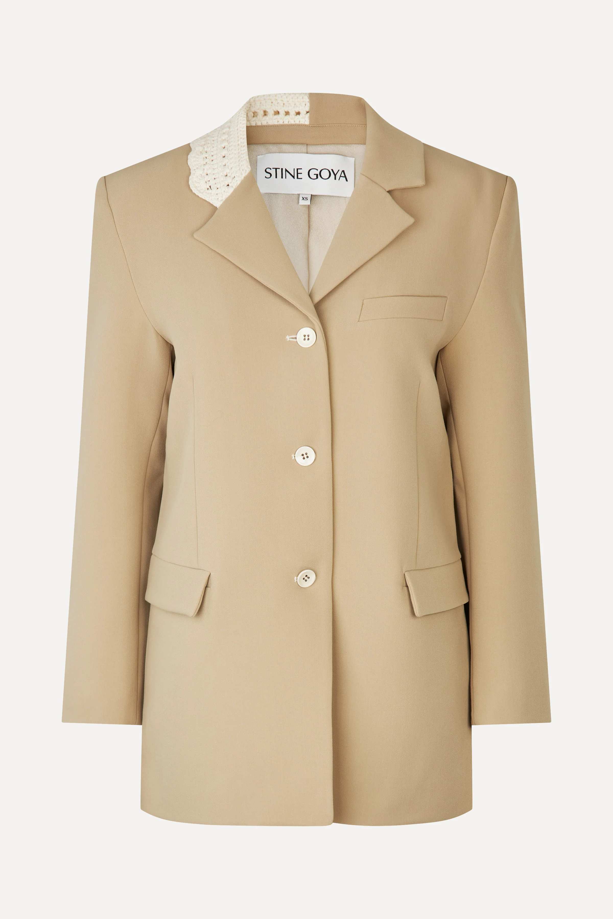 Beige coloured tailored blazer crafted from a structured material with a relaxed fit. Designed with front button closure, classic lapel collar, and an off-white crochet detail on one side. Complete the look with the matching skirt.