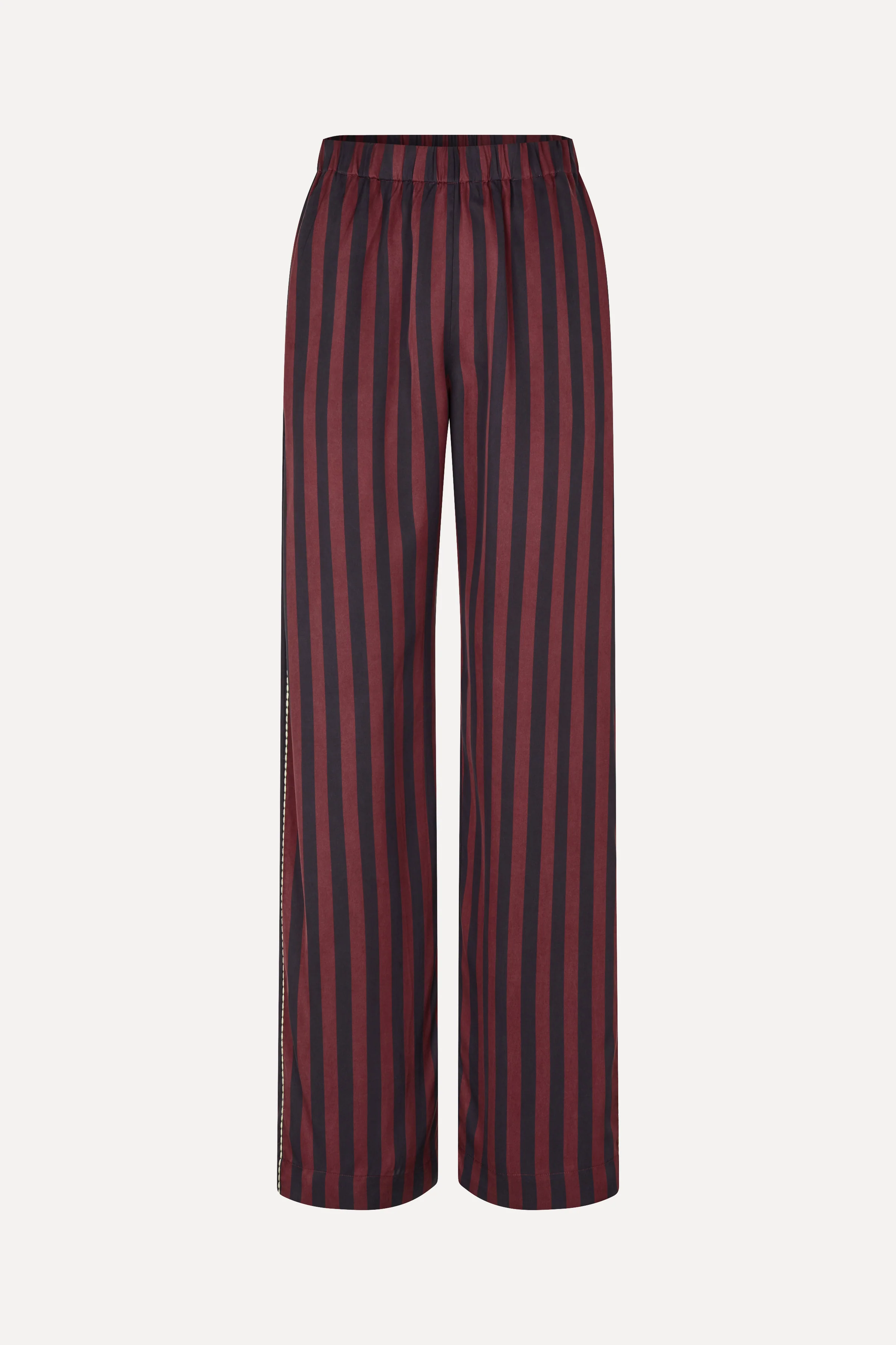 Wide-leg pants in a striped pattern in deep navy and burgundy tones, finished with contrast stitching along the side seams. Designed with an elasticated waist for comfort, and side pockets for functionality. Pair with the matching long-sleeve shirt for a complete coordinated look.