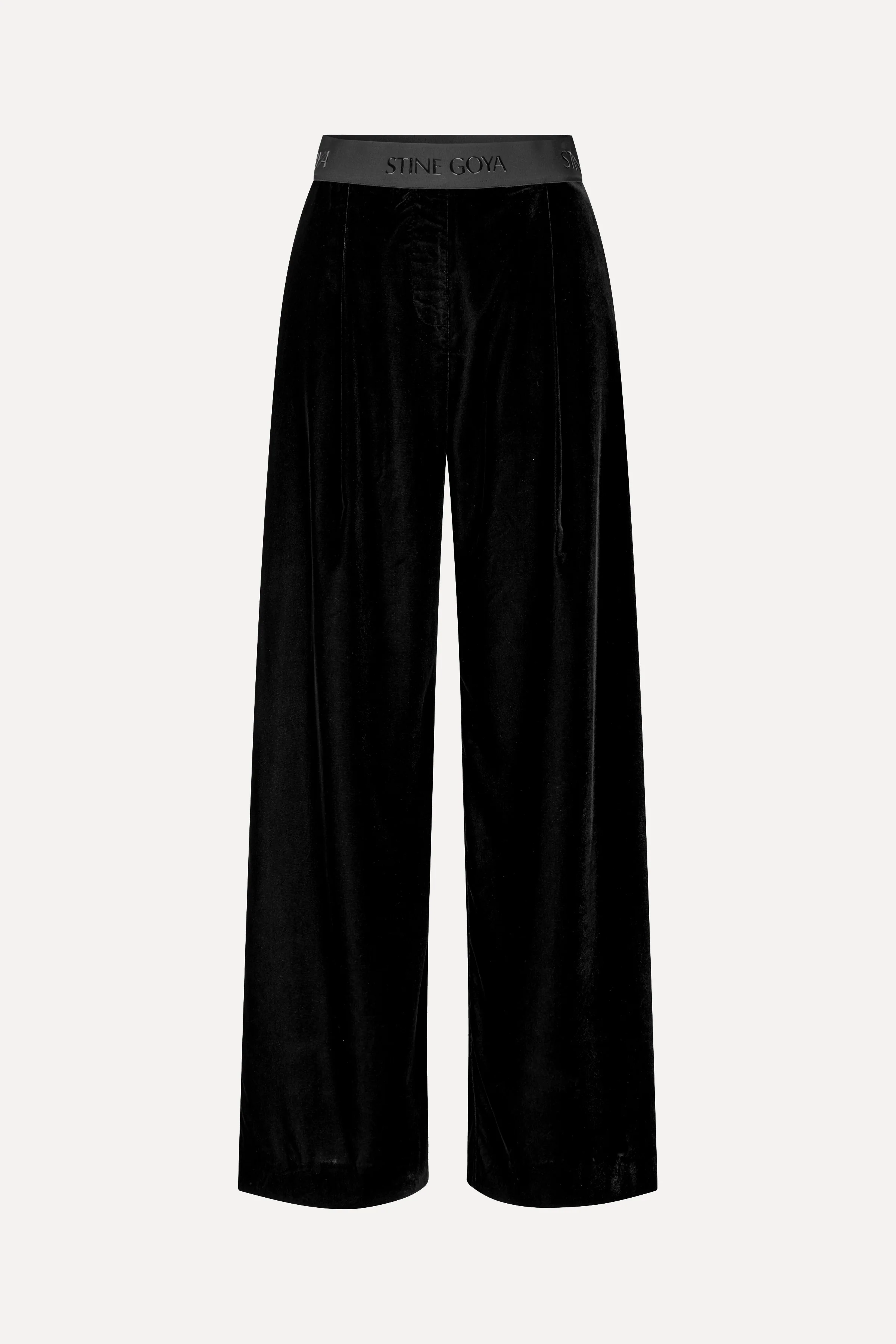 Relaxed-fit black velvet pants with a high elasticated waistband featuring subtle STINE GOYA logo detailing. Designed with a wide-leg silhouette and a hidden side zipper.