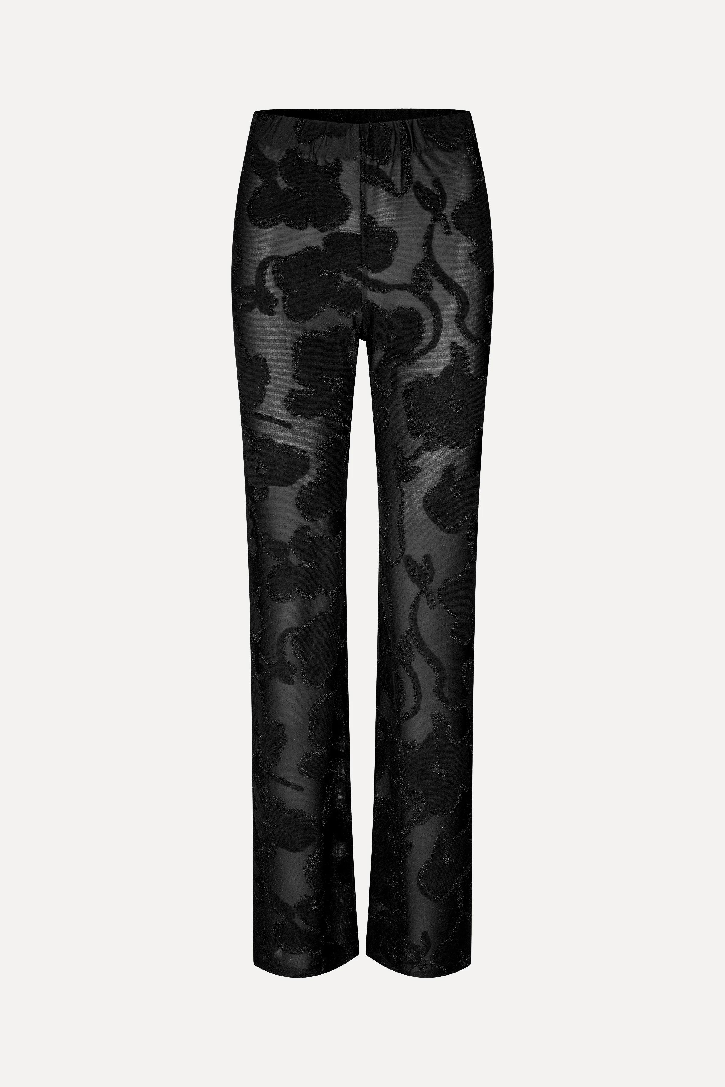 Flattering straight-leg pants in soft black jersey with a black metallic floral pattern. Designed with a high elasticated waist. Semi-sheer. Style with the matching top for a complete look.