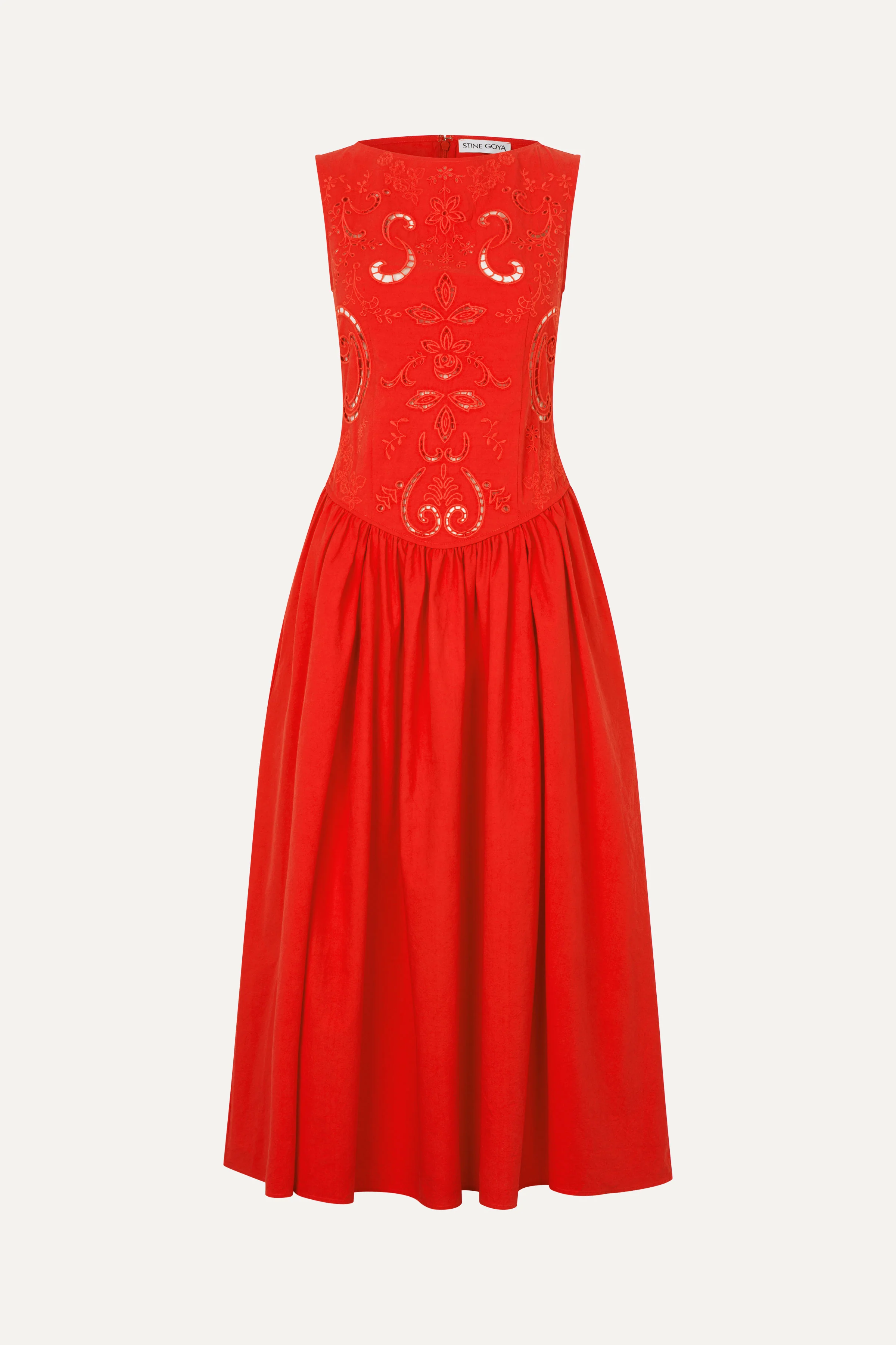 Elegant red midi dress crafted from organic cotton. Features delicate broderie anglaise embroidery on the bodice, a fitted waist with a gathered skirt, and practical side pockets. Finished with a hidden zipper closure at the back.