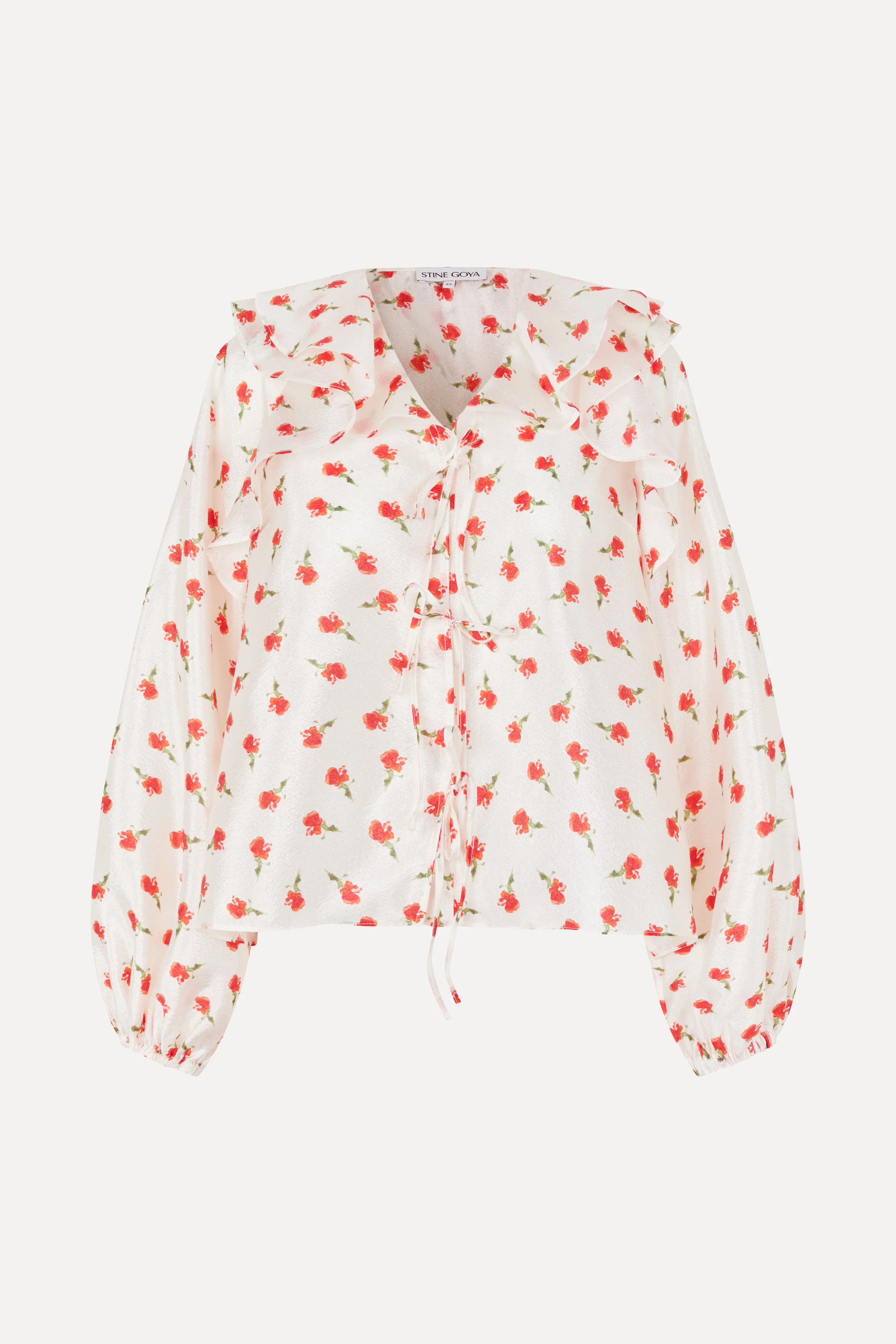 Long-sleeve blouse in off-white with a delicate red floral print. Designed with a ruffled collar, bow tie detail at the front, and voluminous puff sleeves with elasticated cuffs. Cut for a relaxed silhouette and made from a light, softly structured fabric.