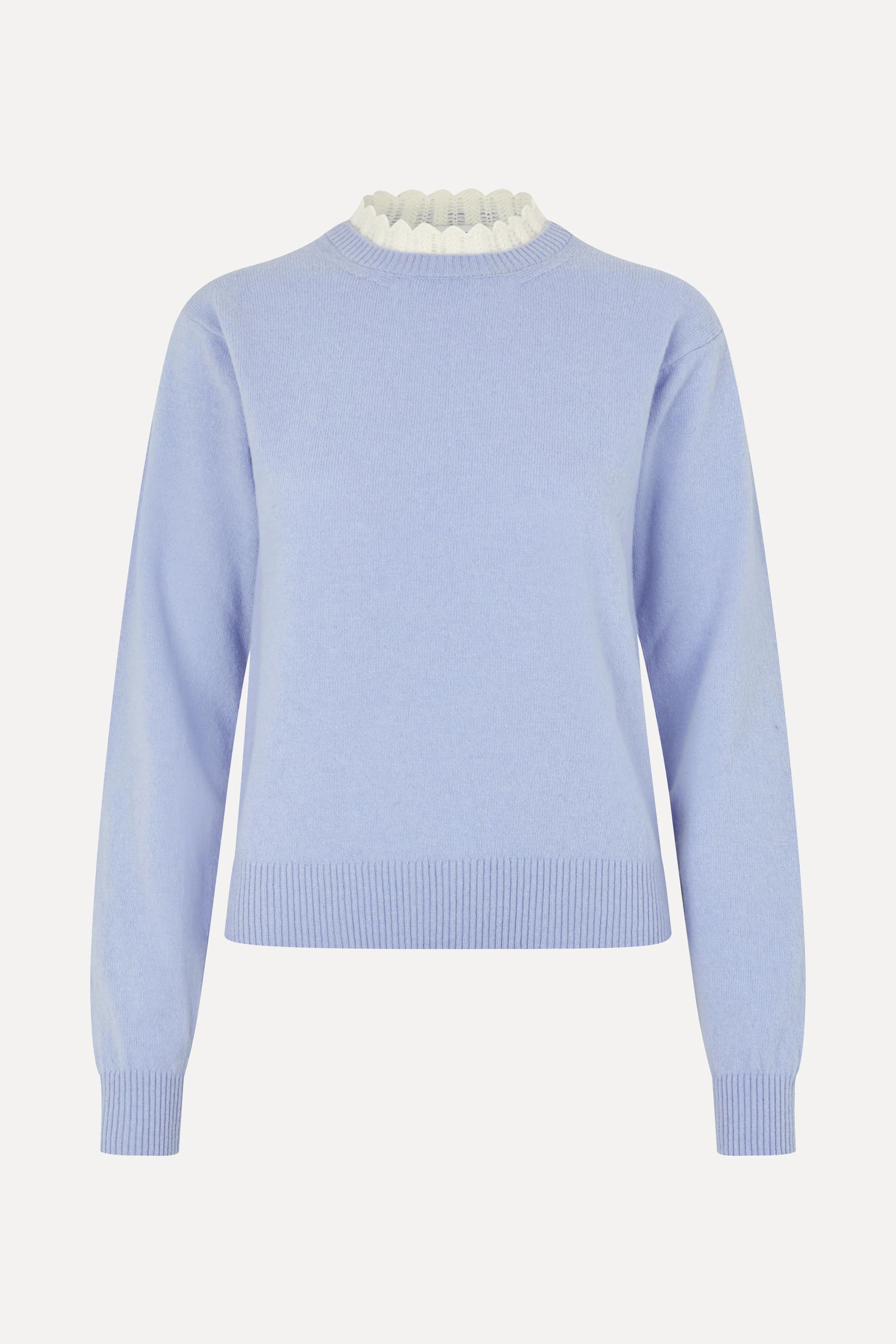 Light blue crewneck sweater crafted from a soft wool blend. Features a classic silhouette with ribbed trims and a delicate white ruffle detail at the neckline.