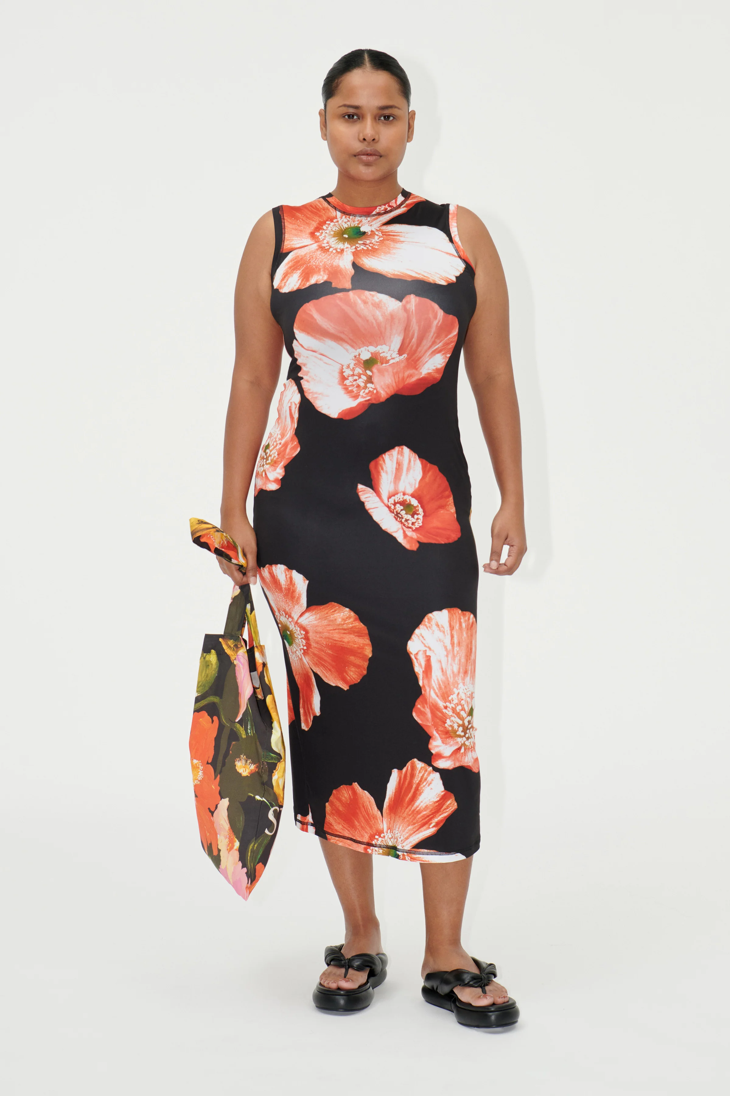 Sleeveless mid-length dress with a fitted silhouette and bright pattern with poppies on soft stretchy material. Pair with your favourite accessories from the collection.