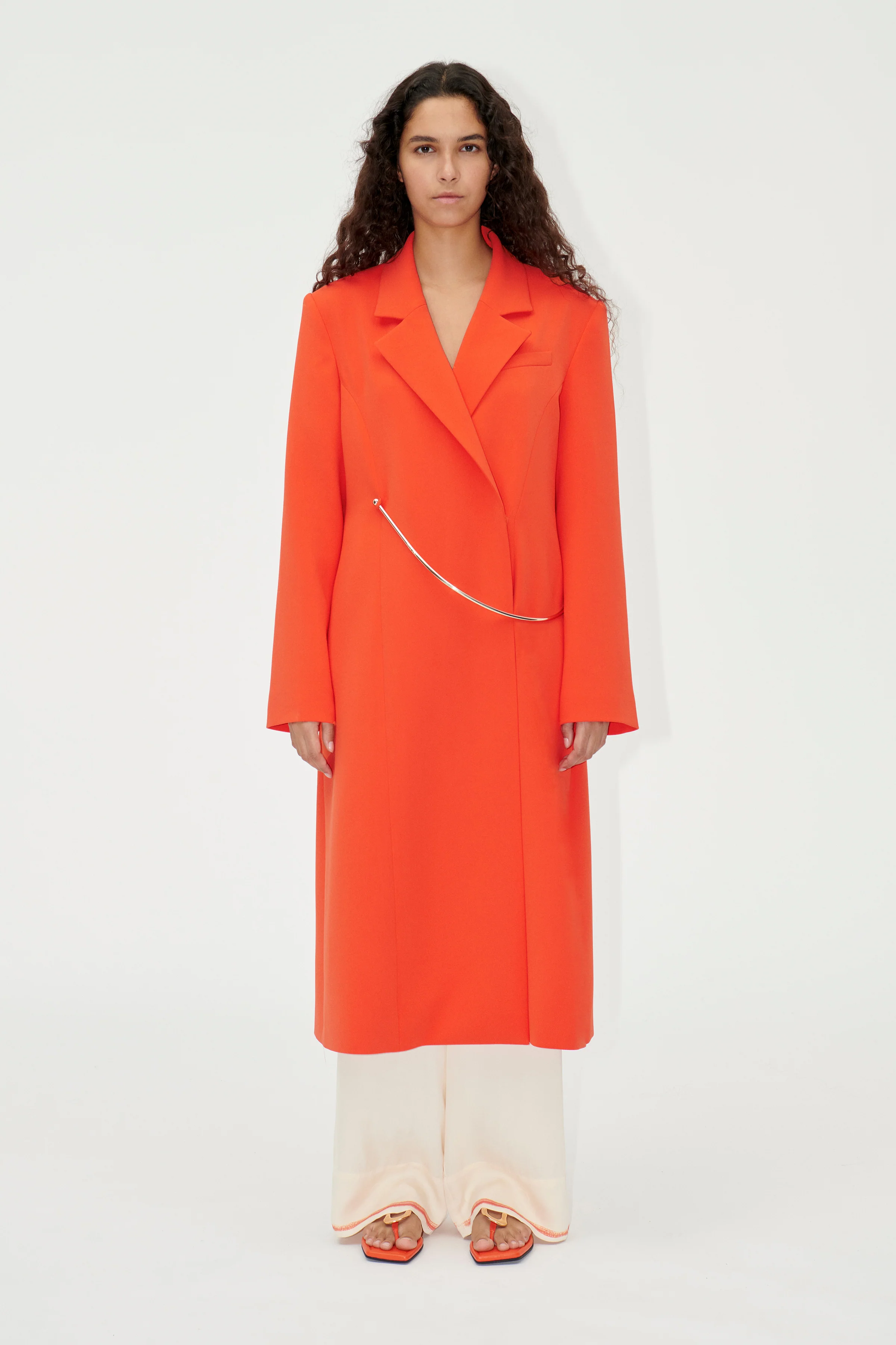 Elegant mid-length coat with a double breasted fit, relaxed long sleeves and gold metallic belt detail. Fully lined. Layer over your favourite look from the collection.