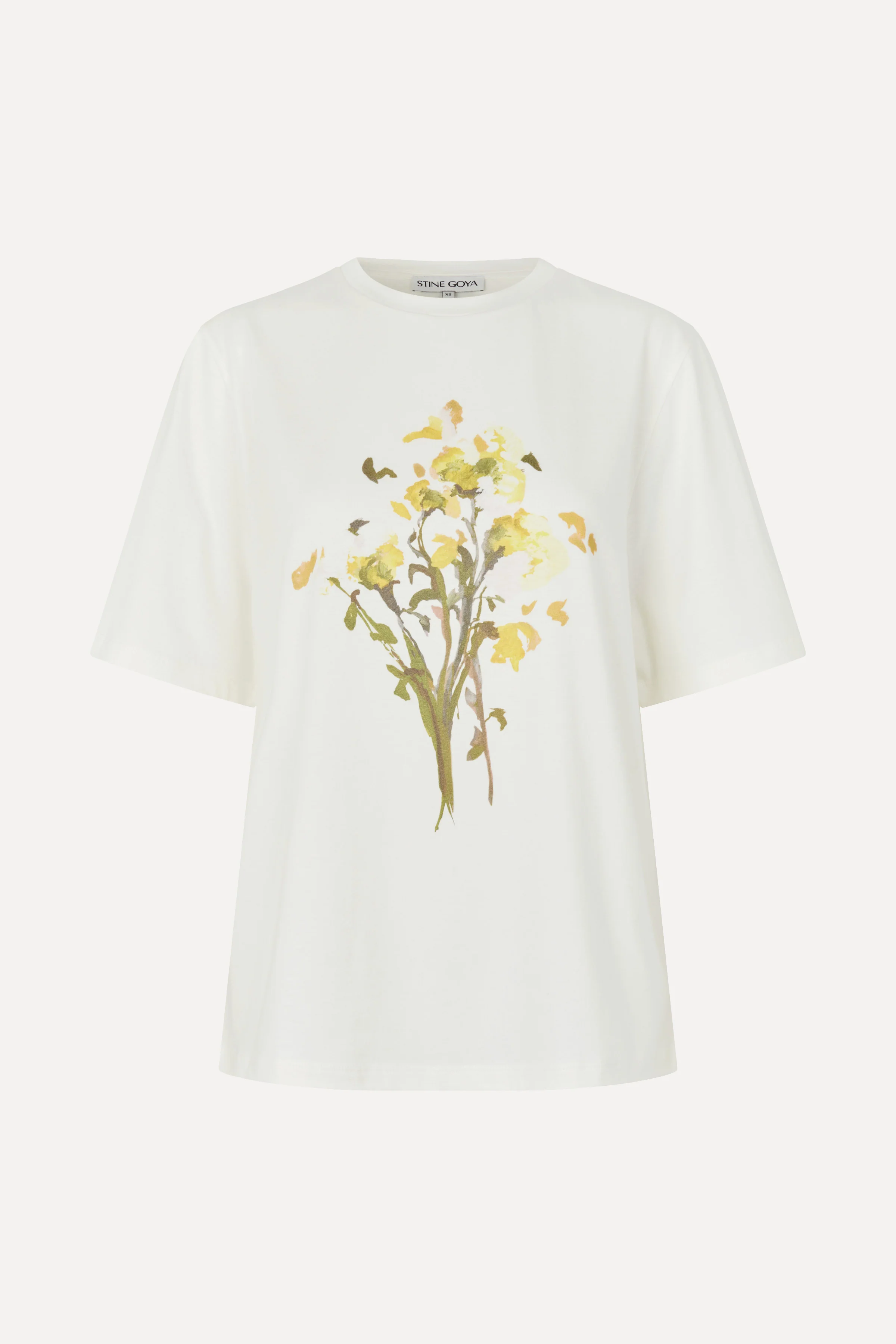 White short-sleeve T-shirt crafted from soft cotton, featuring a yellow floral bouquet print on the front and a handwritten-style checklist graphic on the back. Designed for a relaxed fit with a classic round neckline. A playful everyday staple with thoughtful details.