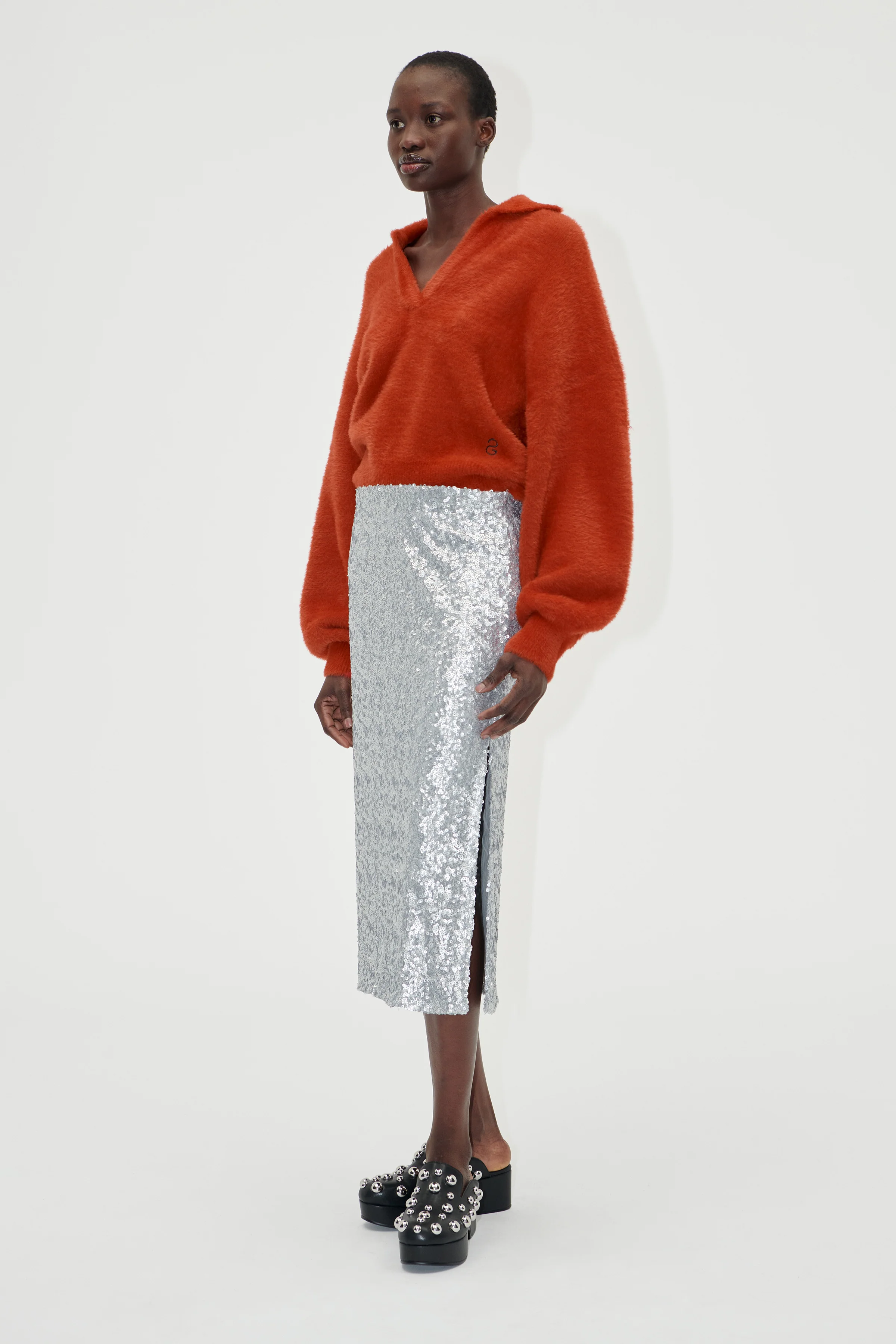 Relaxed mid-length skirt with a stretchy highwaist, slip skirt layer and bright metallic sequined material. Pair with the Double Collar Shirt in Steel Grey and the 24H Studded Boots in Jet Black.