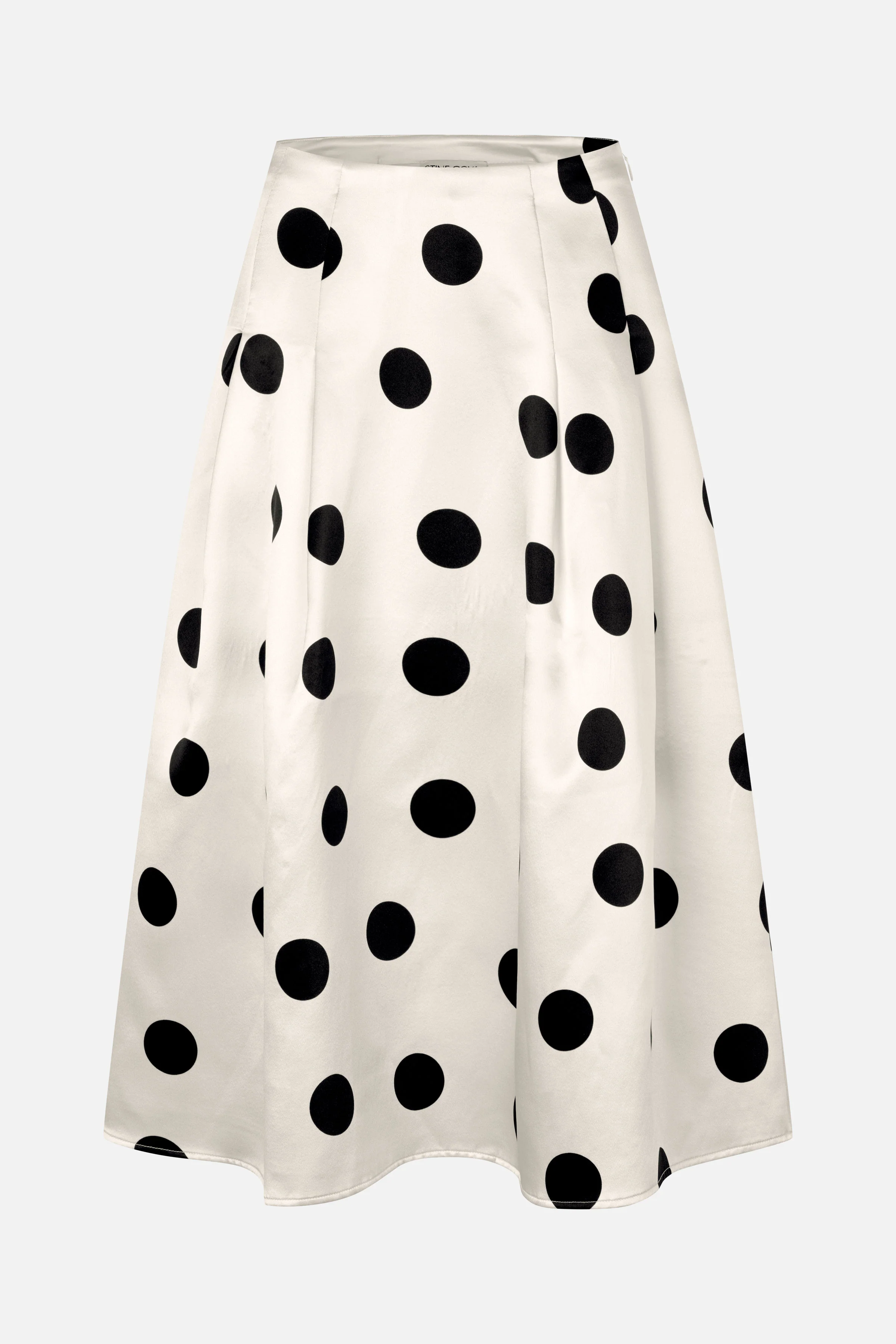 Elegant white silk midi skirt with black dots. Designed with pleats at the waist, an A-line silhouette, and a hidden side zipper. Fully lined. Complete the look with the matching top.