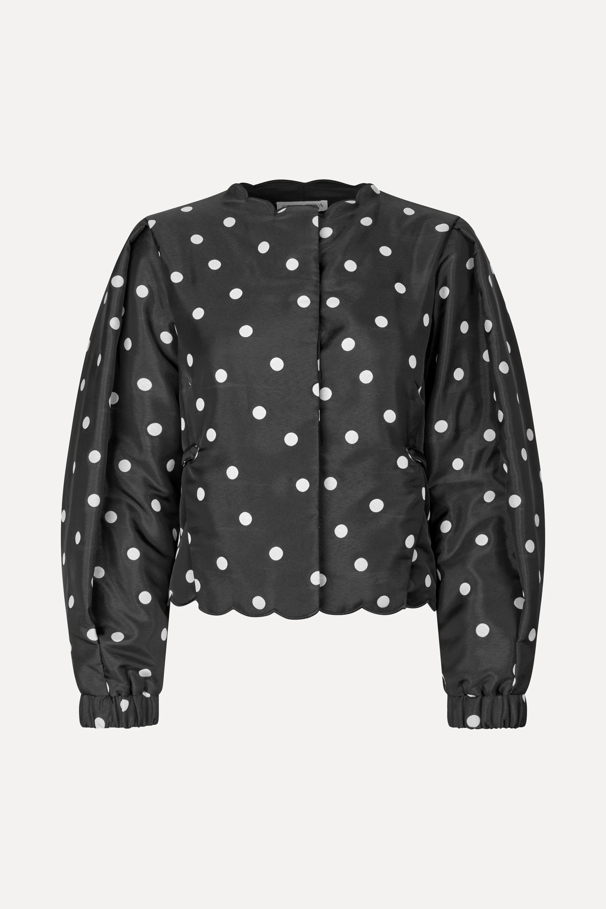 Black short jacket with white polka dots. Designed with soft padding, scalloped edges, elasticated cuffs, and a hidden front closure. Features adjustable waist straps with snap buttons and full lining for comfort and structure. Perfect for transitional layering.